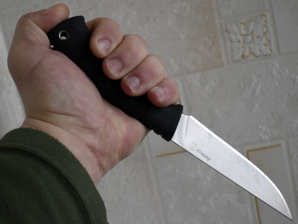 Эргономика. Длина рукояти 110 мм. Для моей кисти - в самый раз. И хотя предпочитаю у стопроцентно (а какие ещё берут в поле?) рабочих ножиков небольшой запас по длине, тут как-то это особого дискомфорта не доставляет. В базовых хватах - прекрасно ложиться в руку, баланс - на первую 1/3 рукояти от клинка, ножом легко и приятно манипулировать и перехватывать.