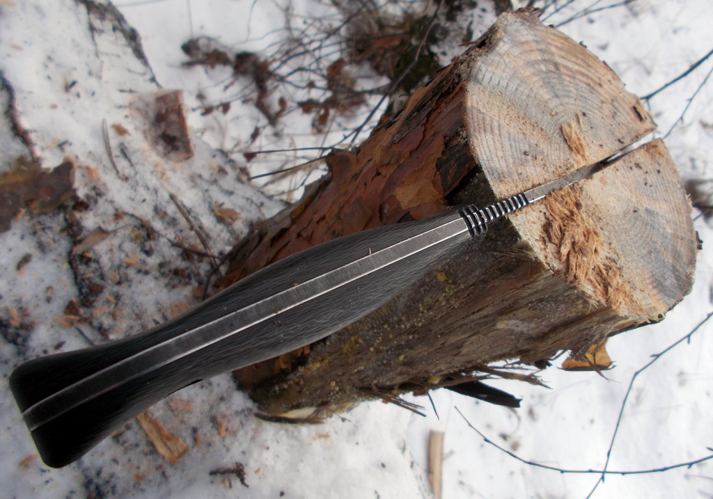 Клинок - необходим комплекс свойств, как правило частично диаметрально расходящийся с параметрами хорошего режущего инструмента. Во-первых длина клинка - чем длиннее, тем больший диаметр полешка вам будет возможно разбатонить. Во-вторых - толщина. Чем толще тем легче сам процесс колки. Тонкий клинок (как на кухонниках) вы просто намертво заколотите в торец полена не добившись ровно никакого результата, а выглядывающий кончик скорее всего сломаете ударом колотушки. В третьих, строй клинка - чем "топорней" тем конечно же лучше. Даже при солидной толщине обуха, но сведенный на минимальную толщину к режущей кромке с высокими спусками (от того же обуха например) и уже есть шансы помучатся, если древесина попалась не образцово "колкая", ведь даже выглядя сухой, она может оказаться лишь подвяленной, и хранить в себе остатки влаги содержащейся в ней при жизни, что затруднит достижение цели (про древесину поговорим отдельно). Лично я считаю идеальным вариантом - длинномер, например мачете, единственно что - часто попадаются с тонковатыми клинками в пару миллиметров, тут опять необходимо вдумчиво подойти к выбору, какие задачи для неё ставите в приоритет.